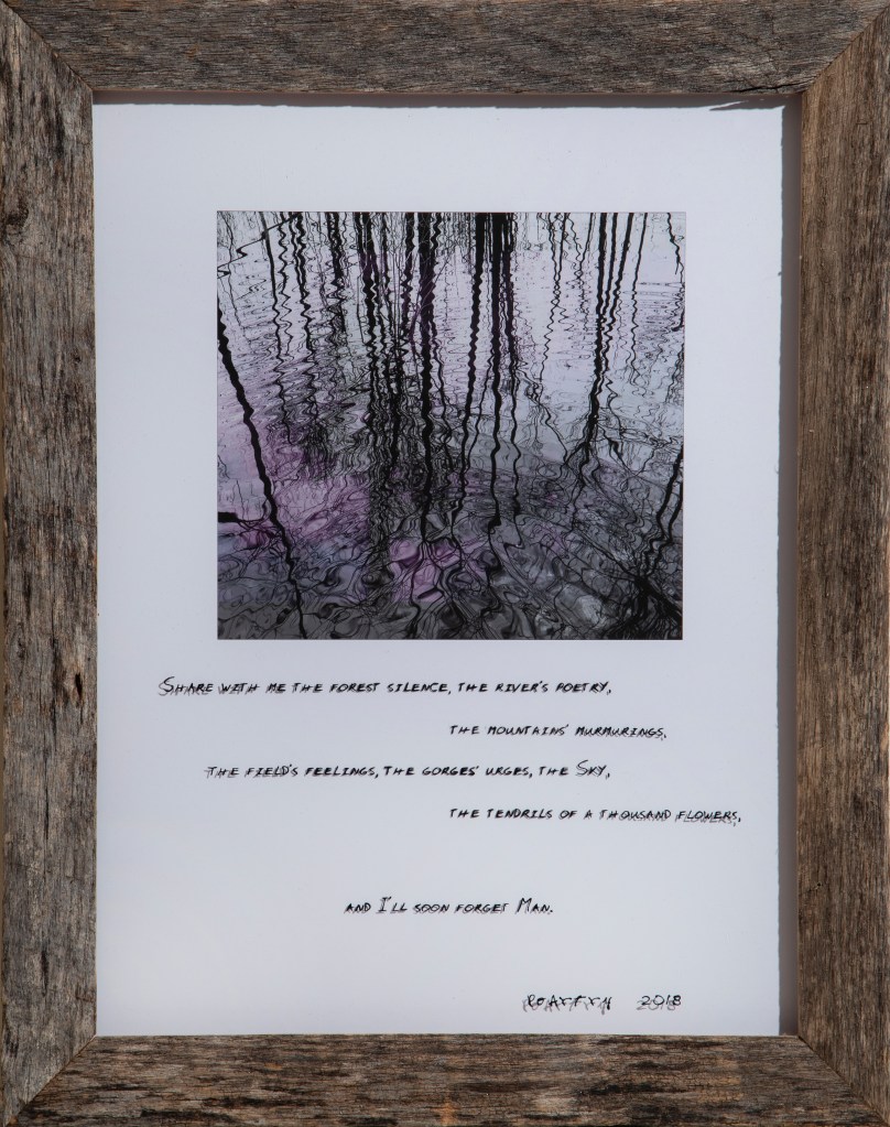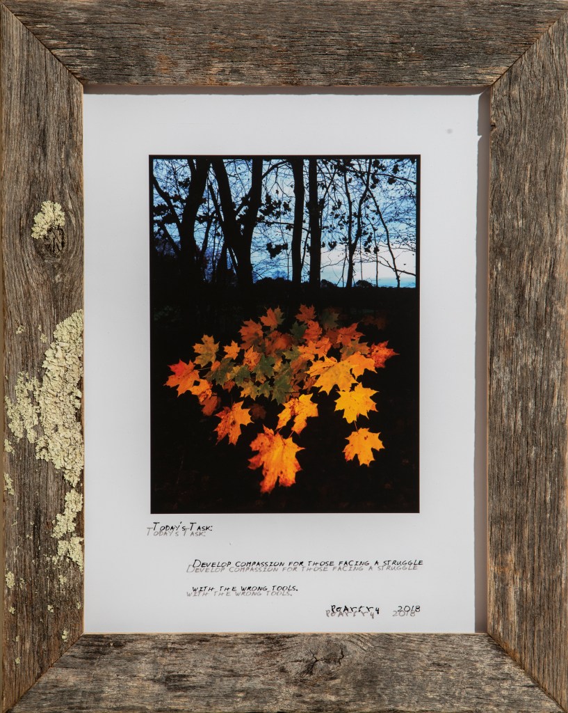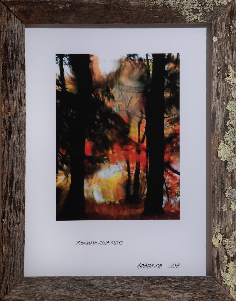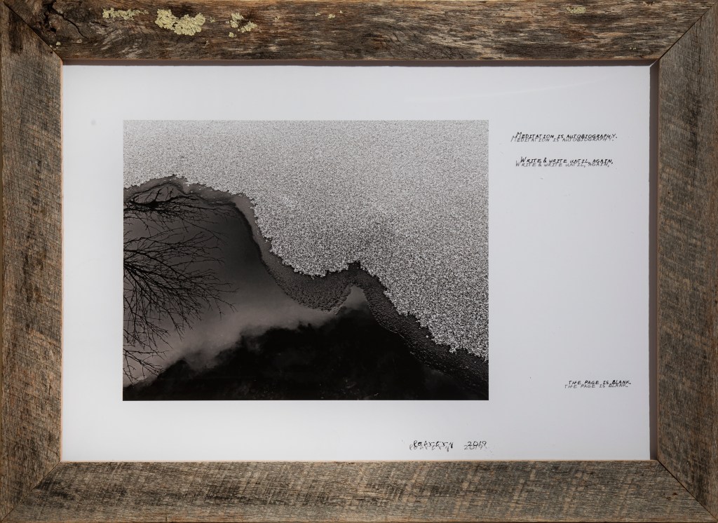 “Farming is the sowing of, tending to, and harvest of Sustenance and Self. From seed to soil to soul. We are all bounded, like these images, by walls, by ideas, by fencing. The meditation and horse farm where I live and teach philosophy and movement arts once presented these oak rails as horse fencing. They now frame perspectives, and continue on as the lifestuff of lichen. They now direct one’s view inward which is the surest way to glimpse the extrinsic.