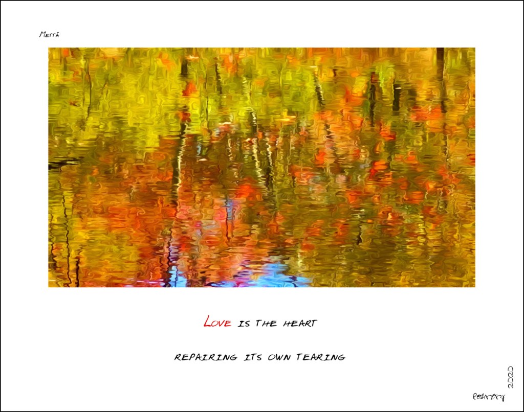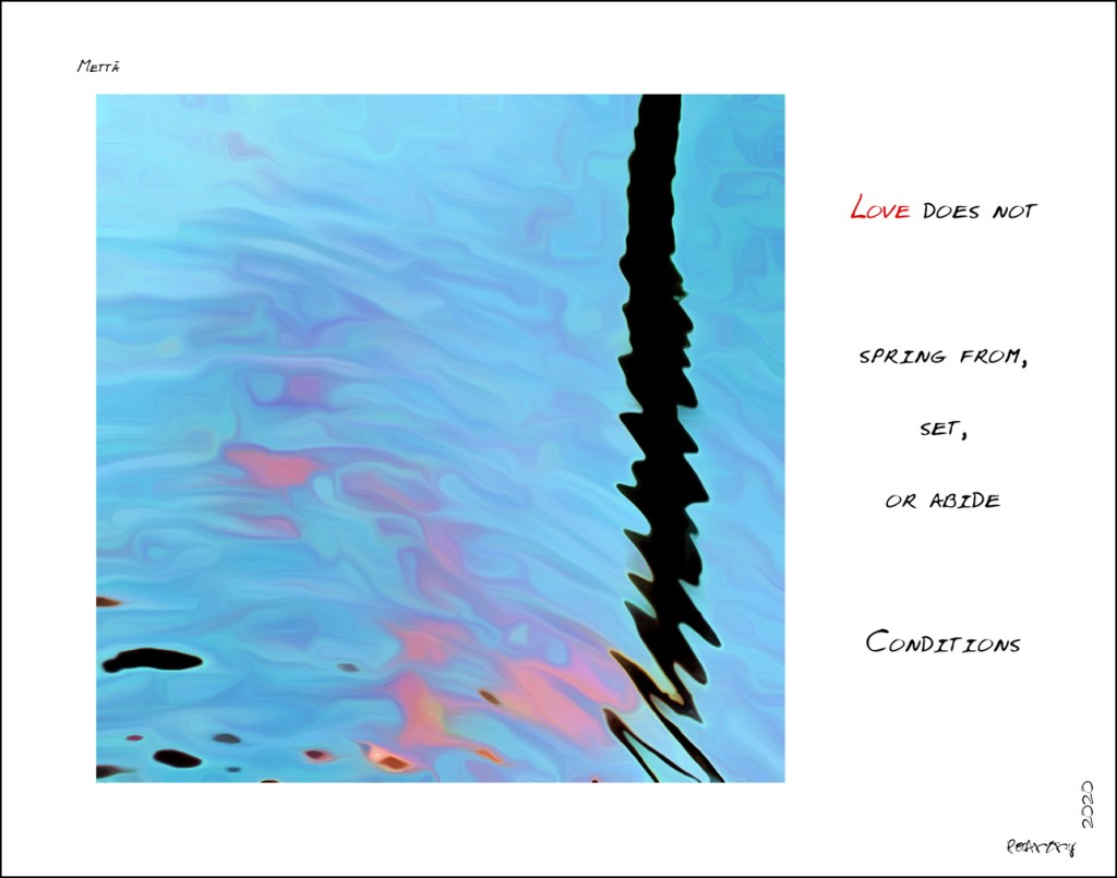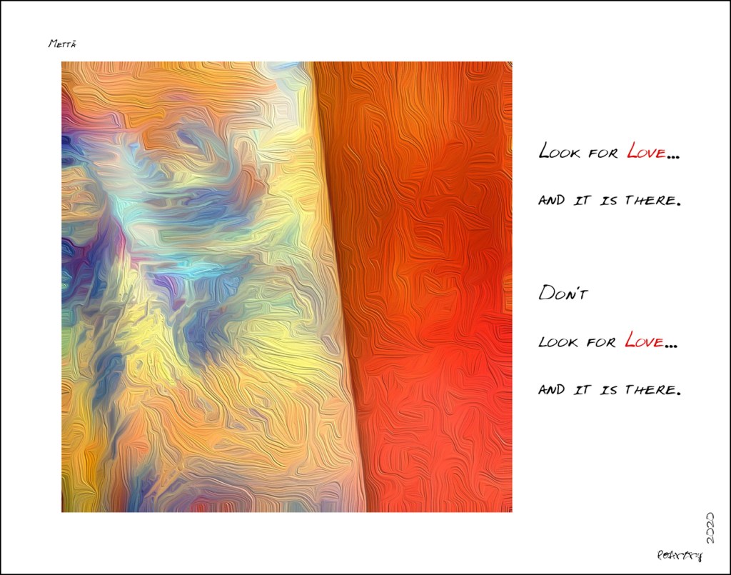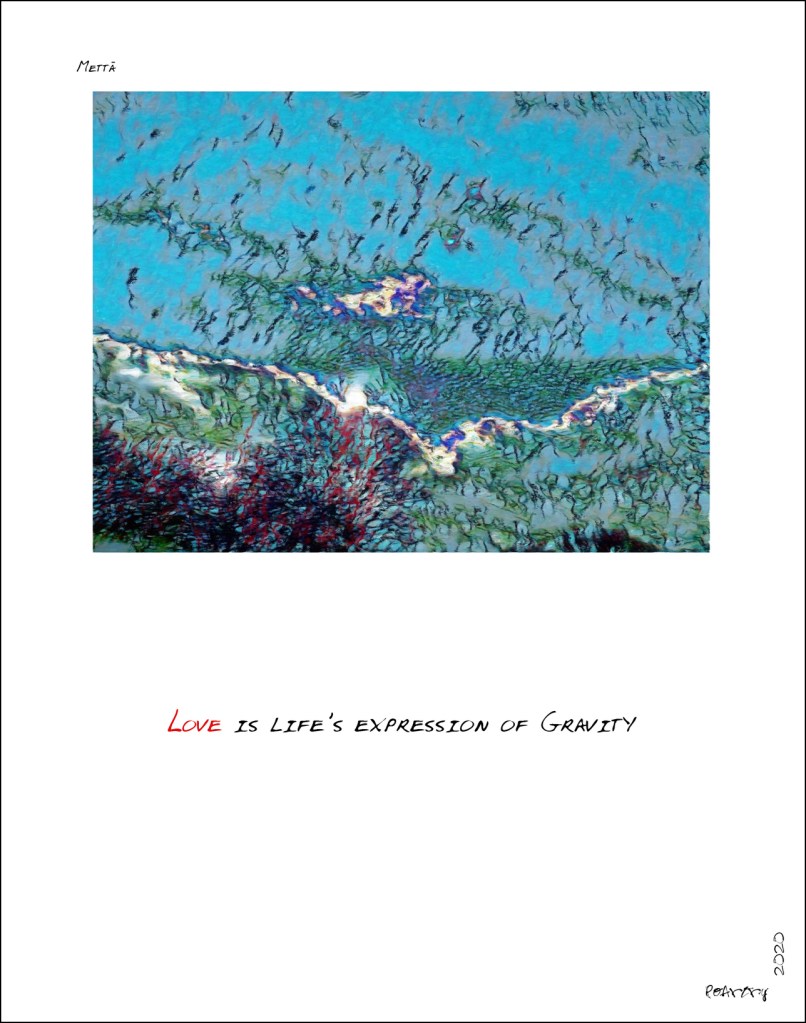 Meditation, similarly, is a Path to self-seeing, and thus other-understanding. My works are designed to test the hypothesis that teaching might be done both without the teacher present and perhaps with the teacher never having been present. Can someone gain the entirety of my teachings without ever having met me…by simply coming into communion with Art on a Wall? To see beyond the wall and into themselves? Can poetry invite their child-mind to undefendedly encounter deep Wisdom, to reunite with Source?
