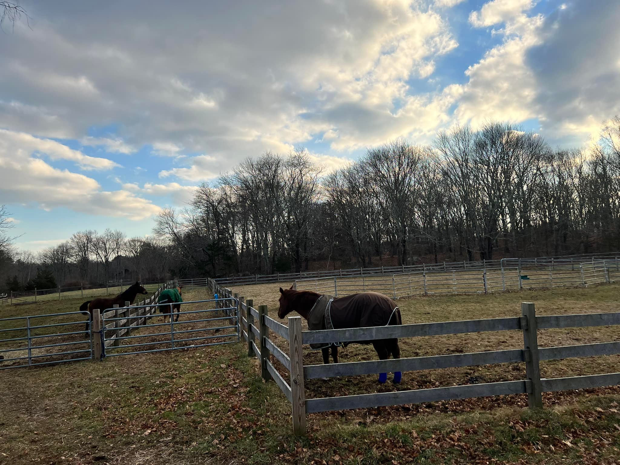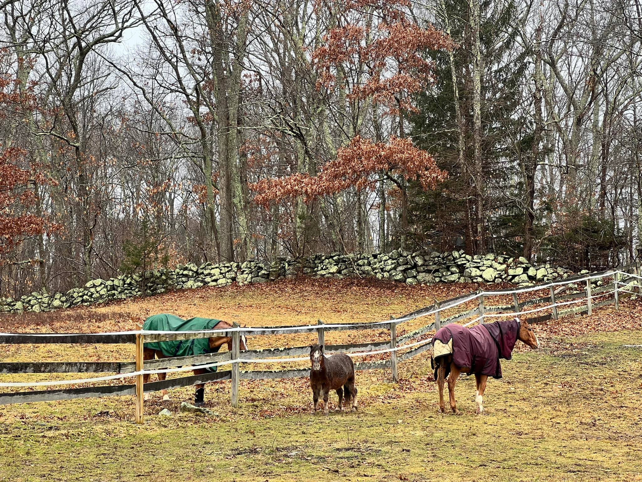 There are seven stalls and eight paddocks and one outdoor riding ring. Most paddocks are fully fenced in three-rail oak though some are bordered by bramble or berries and other ‘fence lines’ are merely streams or stone walls. Horses are rotated through pastures occasionally, though most settle into a fitting spot. There are very few and limited trail riding opportunities directly connected to the property.